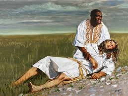 Art 4 God Print of the Good Samaritan painted by Stephen Sawyer, born in Paris, Kentucky.  It is believed that he may have painted this to challenge the sensibilities of the Ruling Class in Apartheid South Africa. See more at www.art4god.com